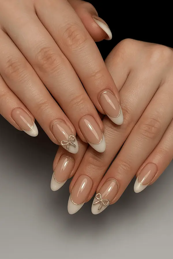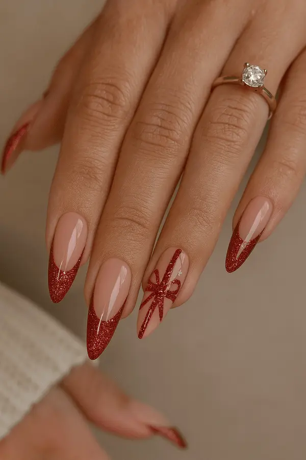 For those who enjoy understated nail art, nude nails with small painted bows are a subtle and stylish option. This design blends seamlessly into both casual and formal holiday settings.