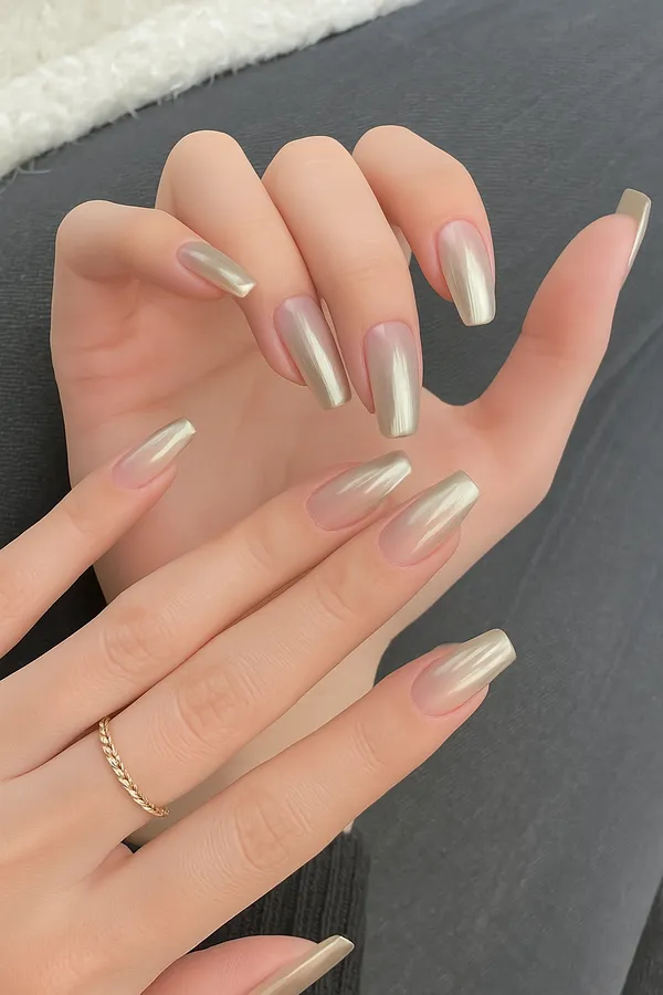 Inspired by the chrome glow trend, glazed bridal nails offer a reflective pearly finish.