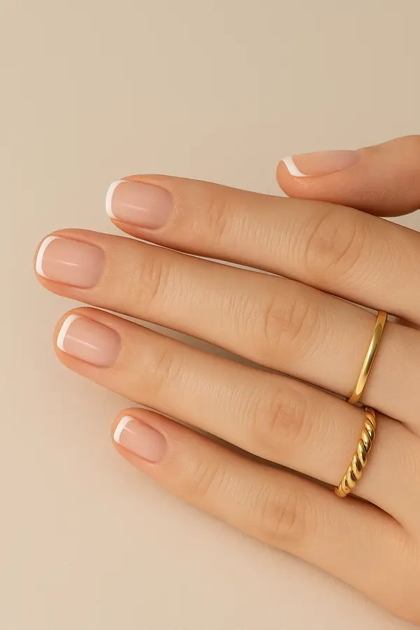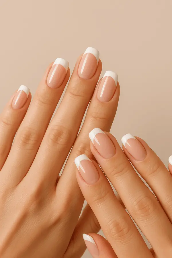 A natural pink or nude base with white tips is the original French manicure look. It is perfect for a clean, polished, and professional finish. This design suits short, medium, and long nails and works for any event or season.
