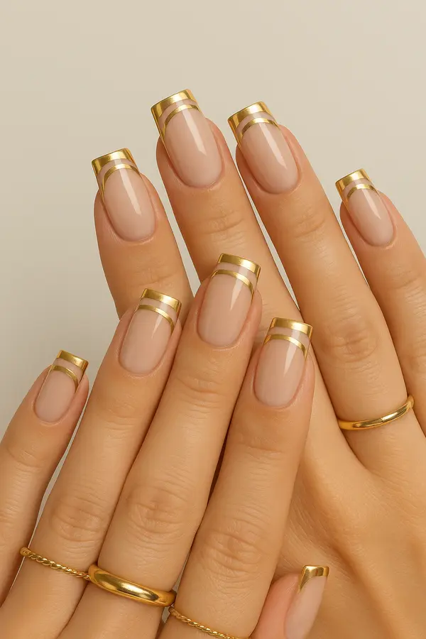 This design features two thin lines across the tips instead of one classic band. It adds a minimal yet eye-catching detail that gives the nails a unique and modern appearance.